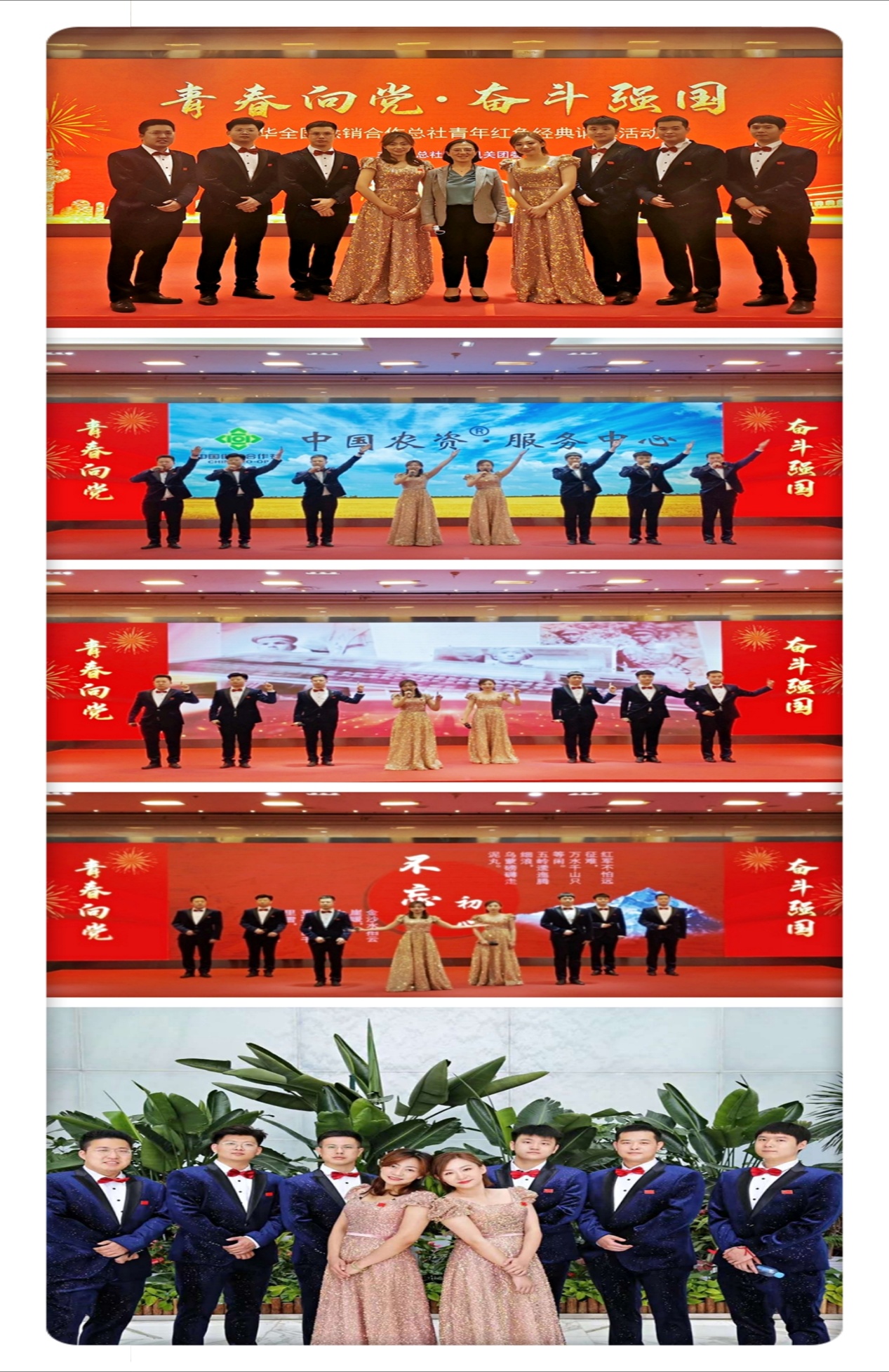 由中农控股团支部选拔的8名团员青年代表压轴表演配乐诗朗诵《不忘初心》,讲述了团员青年们追忆中国共产党艰苦的奋斗岁月,感慨百年征程的波澜壮阔,表达团员青年们发扬红色传统、传承红色基因,鼓起迈进新征程、奋进新时代的精气神,为供销合作事业贡献青春力量的决心,节目得到总社领导及现场观众的一致好评。