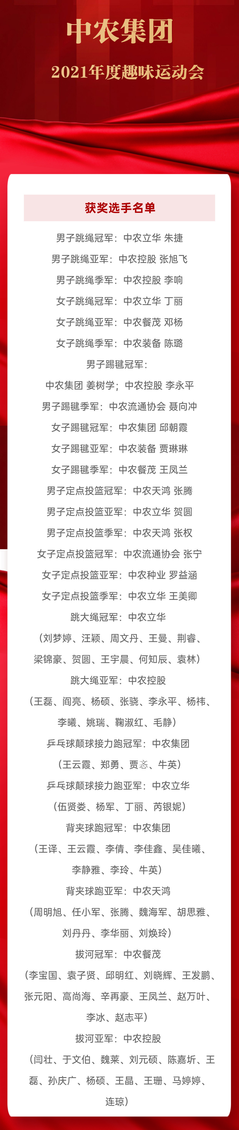 此次运动会充分展现了中农集团广大干部职工强健的体魄,团结、进取、协作的精神,彰显了中农人昂扬向上的精神面貌,进一步激发了大家奋发向上的工作热情。今后,中农集团工会还将以赛带练,进一步组织广大干部职工开展更多有益身心健康的活动。