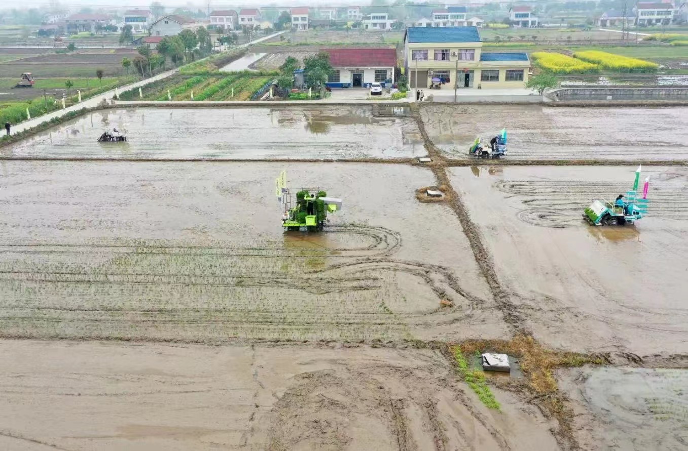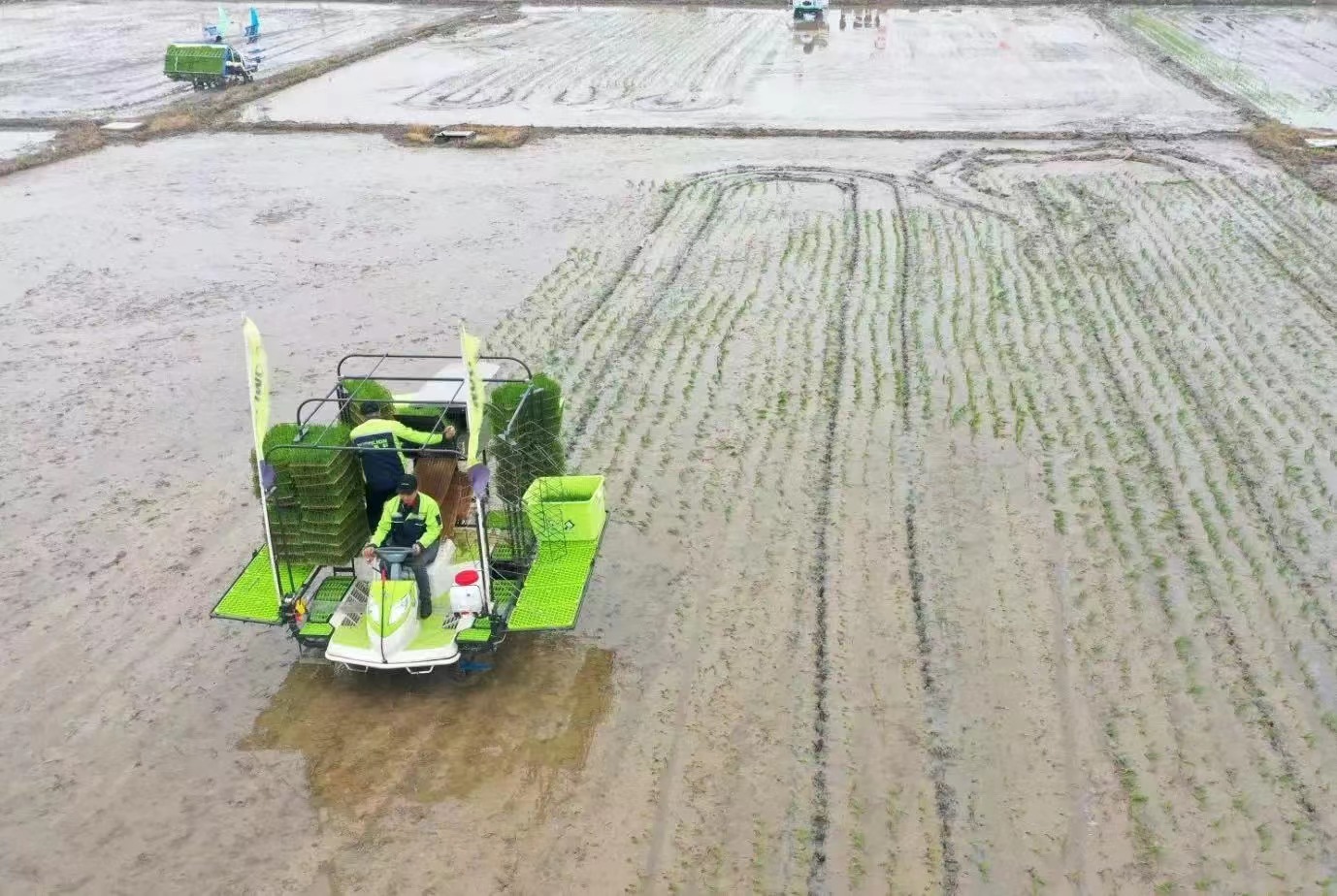 只见水田里,农机来回穿梭,秧苗点点下落,错落有致地挺立在田间,宛如挥笔泼墨般,在春意盎然的大地上,描绘出一幅生机勃勃的锦绣画卷。