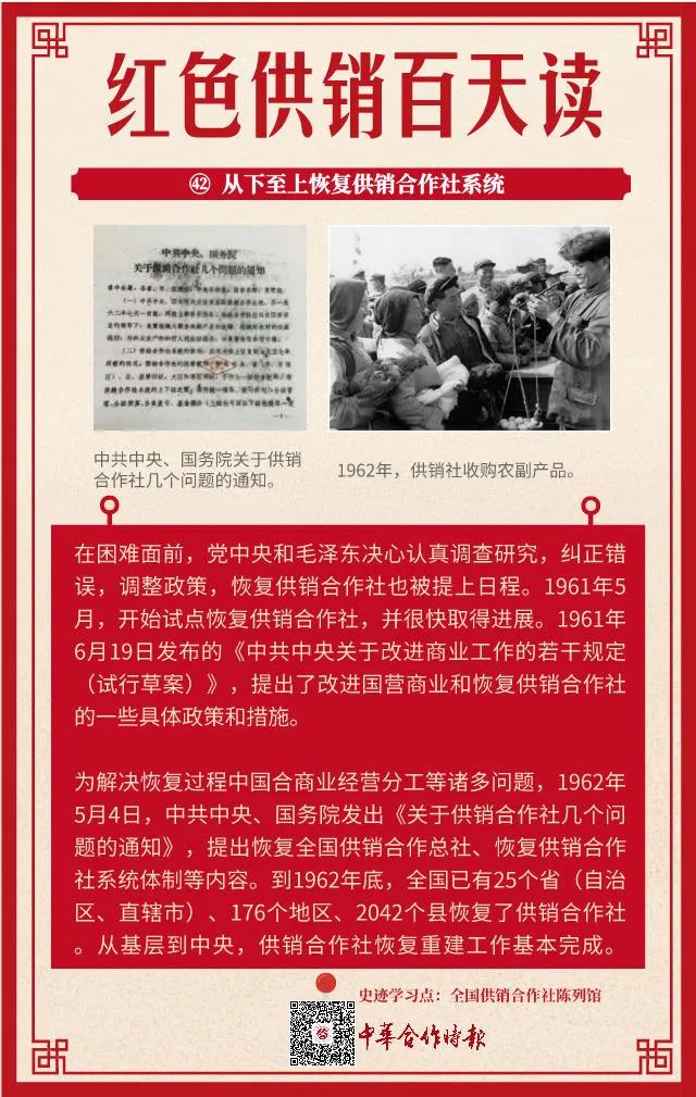 为了适应农村实行生产队为基础的三级集体所有制,1961年6月19日,中共中央发出《关于改进商业工作的若干规定(试行草案)》(简称商业四十条),明确提出恢复供销合作社。现阶段我国商业流通应该有3条渠道,即国营商业、供销合作社商业、农村集市贸易。