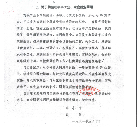 邓小平和彭真在北京市的顺义、怀柔县调查,认为要恢复和发展手工业和家庭副业,必须迅速恢复和健全供销合作社工作,并强调现在必须挑选一些了解农村手工业、家庭副业生产和农民生活需要,有群众观点,会走群众路线的干部来做供销合作社的工作,把供销合作社迅速恢复起来。