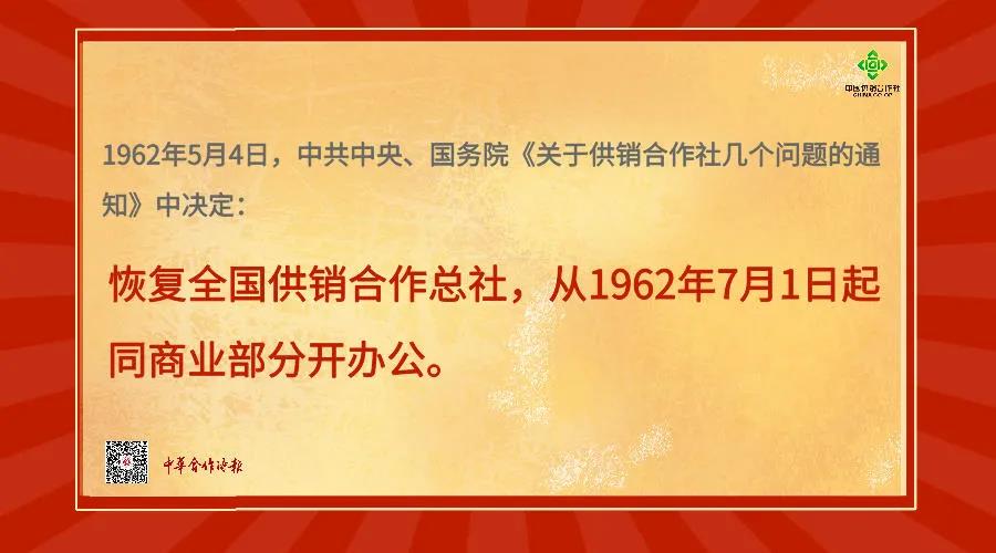 1962 年9月27日,党的八届十中全会通过了《中共中央关于商业工作问题的决定》,系统地总结了建国以来商业工作的经验教训,从理论上阐述了合作社商业的重要性和必要性后,明确指出:“否认合作社商业的必要性,不充分发挥合作社商业的应有作用,是错误的。”我国存在着集体所有制的农业和集体所有制的手工业,同这种生产制度相适应,应该存在着合作社商业。合作社商业是社会主义集体所有制经济,是国营商业的有力助手。各部门应该积极支持供销合作社开展业务。