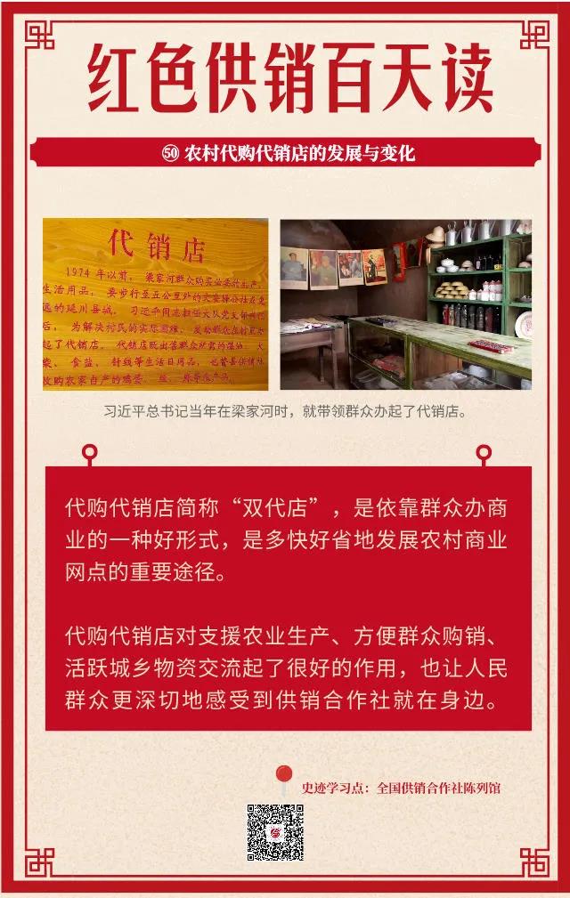 1965年,全国供销合作总社调查组总结了山东省栖霞县采用亦农亦商办法新建农村代购代销店的经验。该县建立代购代销店166个,由原来平均5.16个村、2670 人有一个商业网点,改变为平均3个村、1550人就有一个点,全县有一半群众不出村就可以买到生活必需品、出售零星土副产品和废旧物资。其余群众买卖东西一般不出3华里,大大方便了群众,群众称赞说“拿出个把人,方便一个村。”