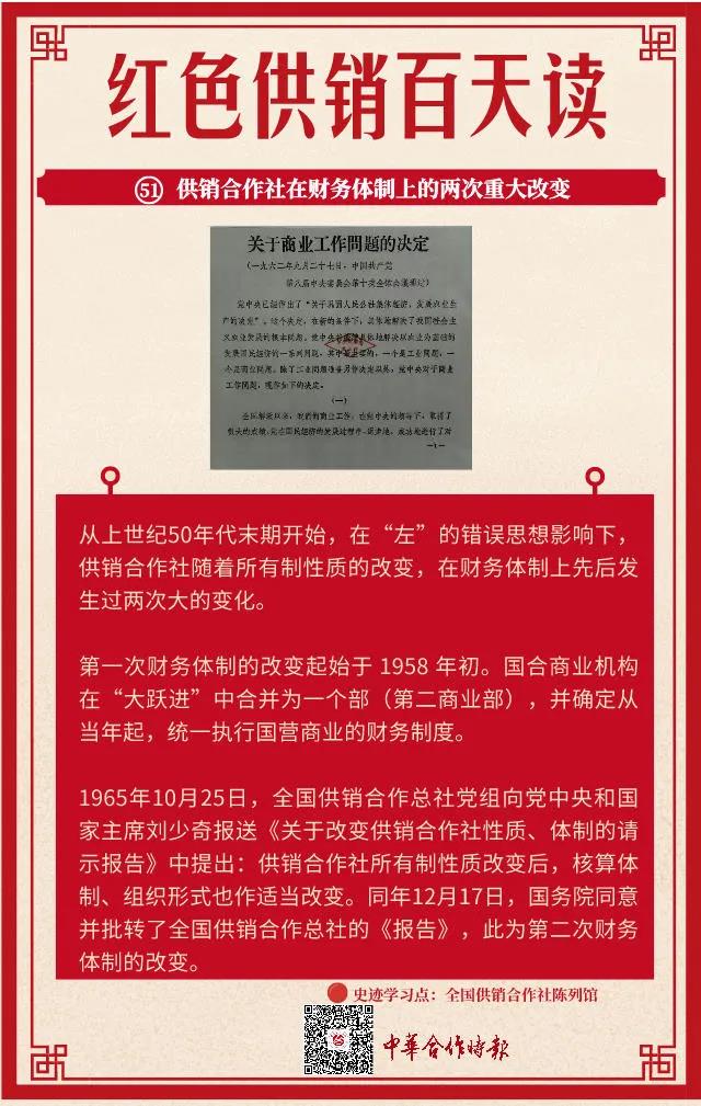 这次财务体制的改变,自1966年至1982年,延续时间长达17年之久。直至党的十一届三中全会以后,在党中央的重视关怀下,经过深化改革,供销合作社重新恢复为农民集体所有制的商业组织,实行分级核算,自负盈亏和利改税制度。