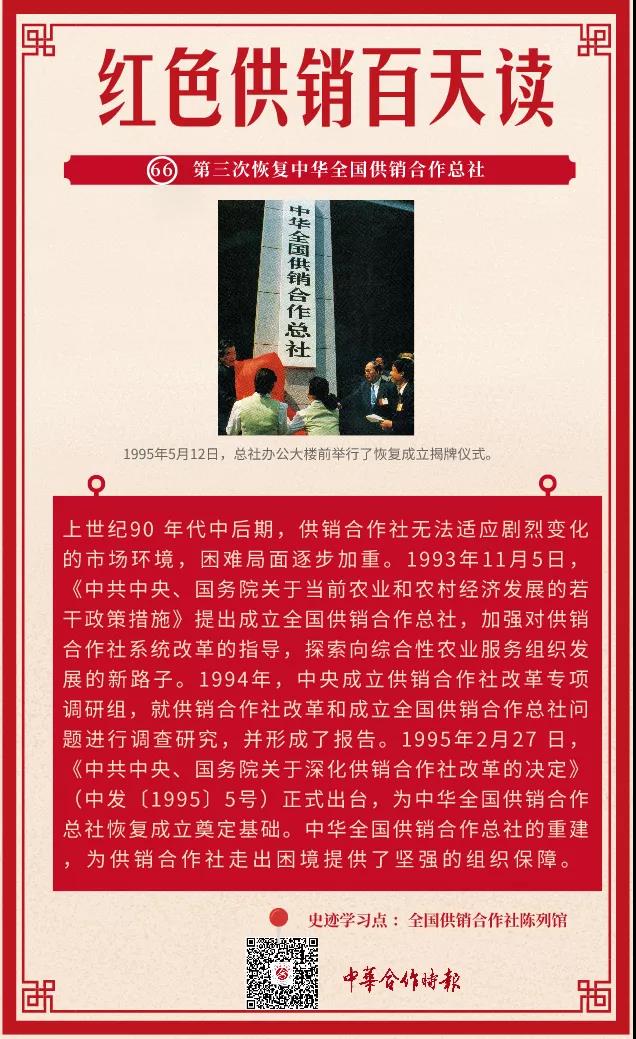 1995年2月27日,《中共中央、国务院关于深化供销合作社改革的决定》正式下发。根据《决定》要求,国务院组成以国务委员陈俊生为首的中华全国供销合作总社筹建组,全面负责恢复总社的各项准备工作。