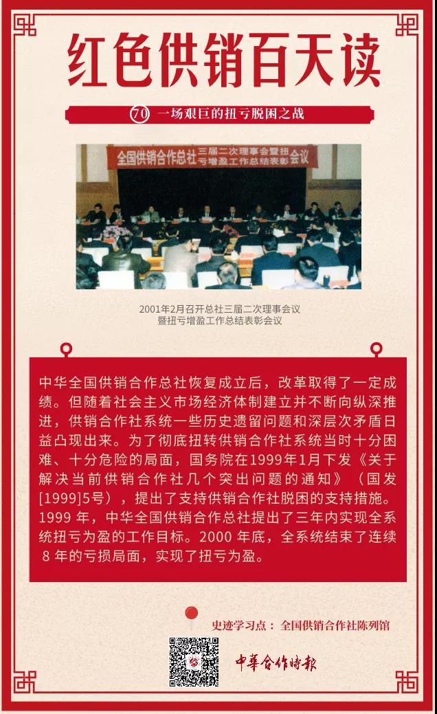 2000 年底,全系统实现利润13.77 亿元,结束了连续 8 年的亏损局面,实现了扭亏为盈,农村基层社整体也于2002年扭亏为盈,为更好服务“三农”创造了有利条件。经过一场艰巨的扭亏脱困之战,供销合作社终于从低谷中走了出来。