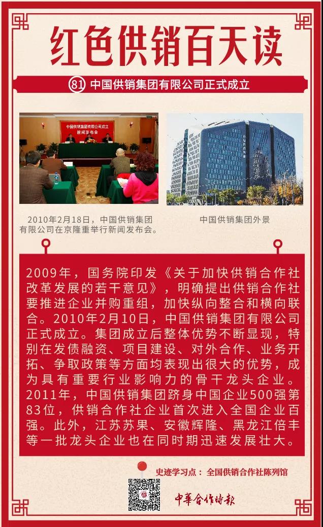 为深化社有企业管理体制改革,优化资源配置,打造全国供销合作社系统企业龙头,2010年1月18日,经国务院批准,中国供销集团在国家工商总局完成注册。2月10日,中国供销集团有限公司正式成立。